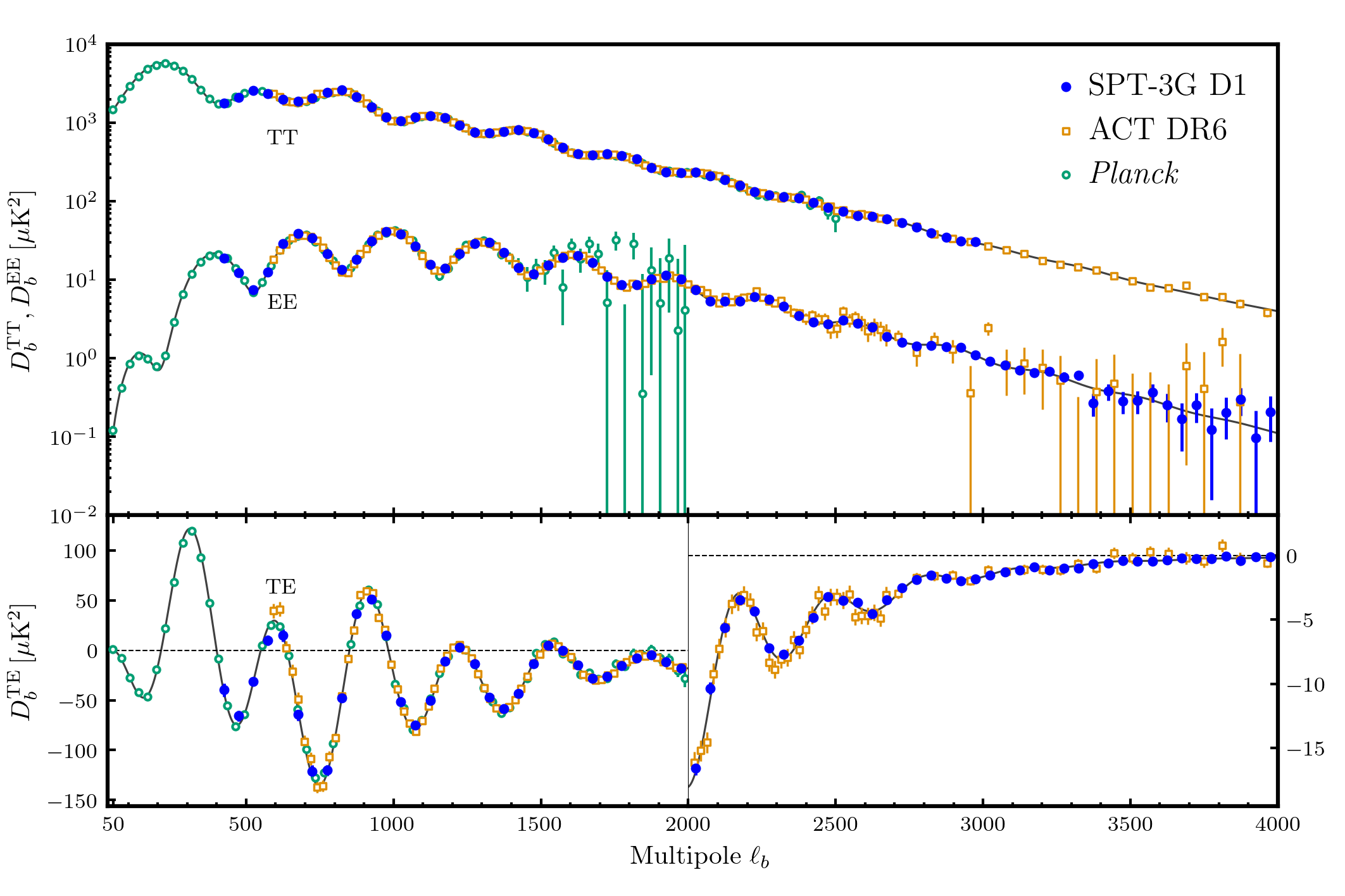 TT, TE, and EE band powers from SPT-3G D1 (blue dots), ACT DR6 (orange empty squares) and Planck PR3 (green empty dots).